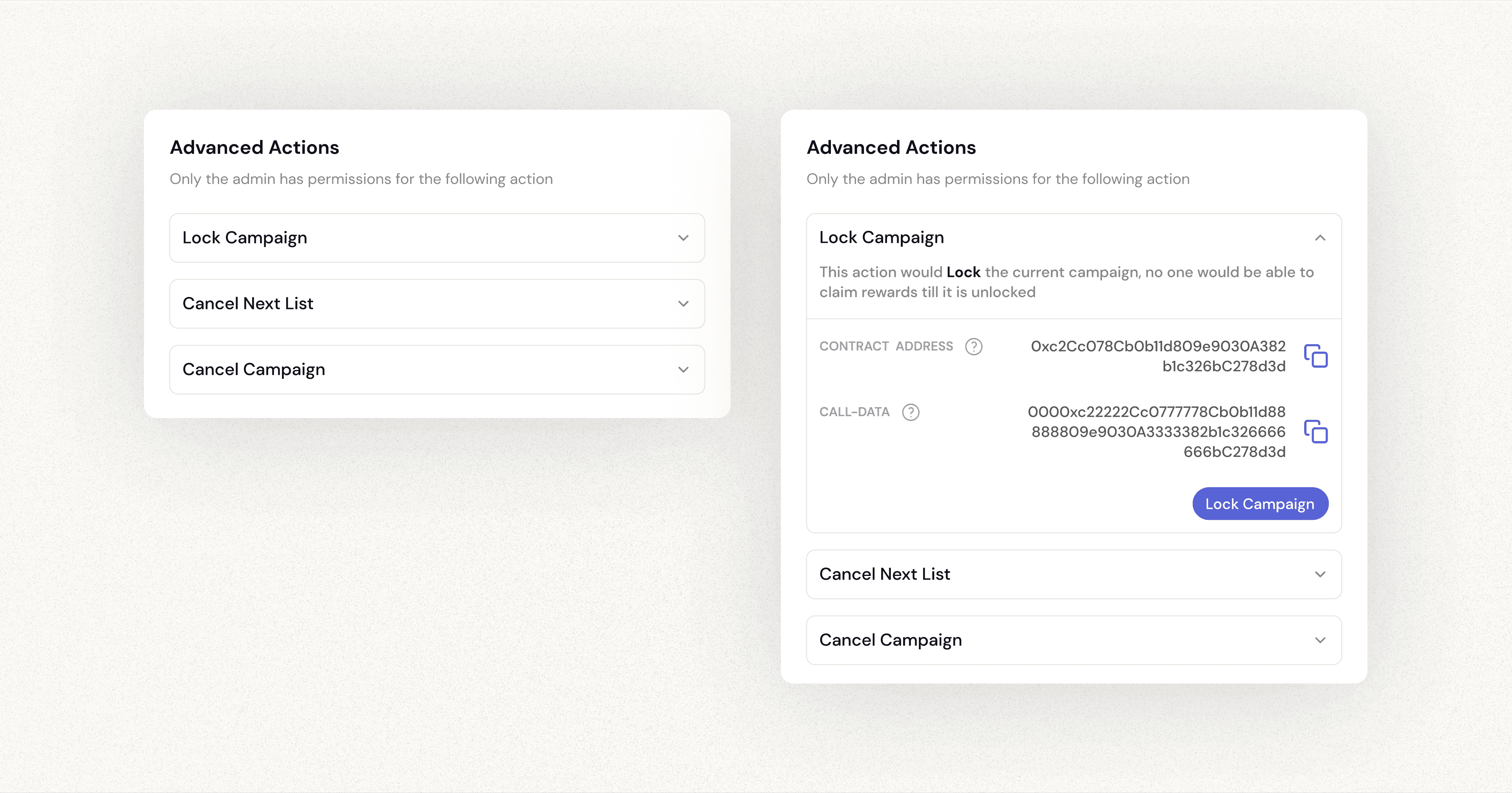 We also wanted these functions to be accessible to DAOs. To do this, we added a button to access advanced options, where the DAO coordinator can easily copy and paste the call-data for Cross-contract interaction. And in the use-case when the advanced option is opened by the account of an individual creator, they simply see clickable buttons to initiate these actions.