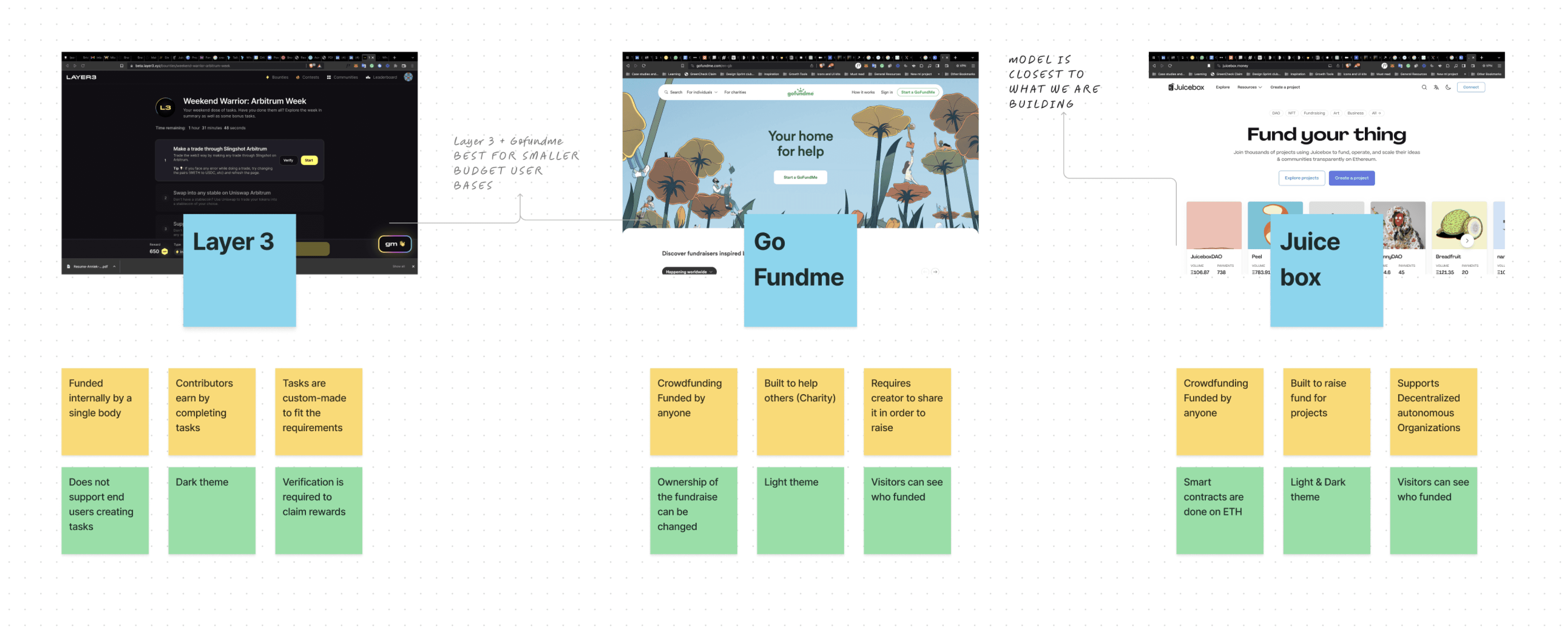 Platforms like Gofund me, Juicebox, Layer 3 were the ones that stood out to us the most. Since they each leveraged some form of incentivised interactions;funds being raised and rewards being given out. By testing each of these platforms and others, we were able to gather specific features that resonated with what we were building as well as ones we felt were impediments to a seamless user experience