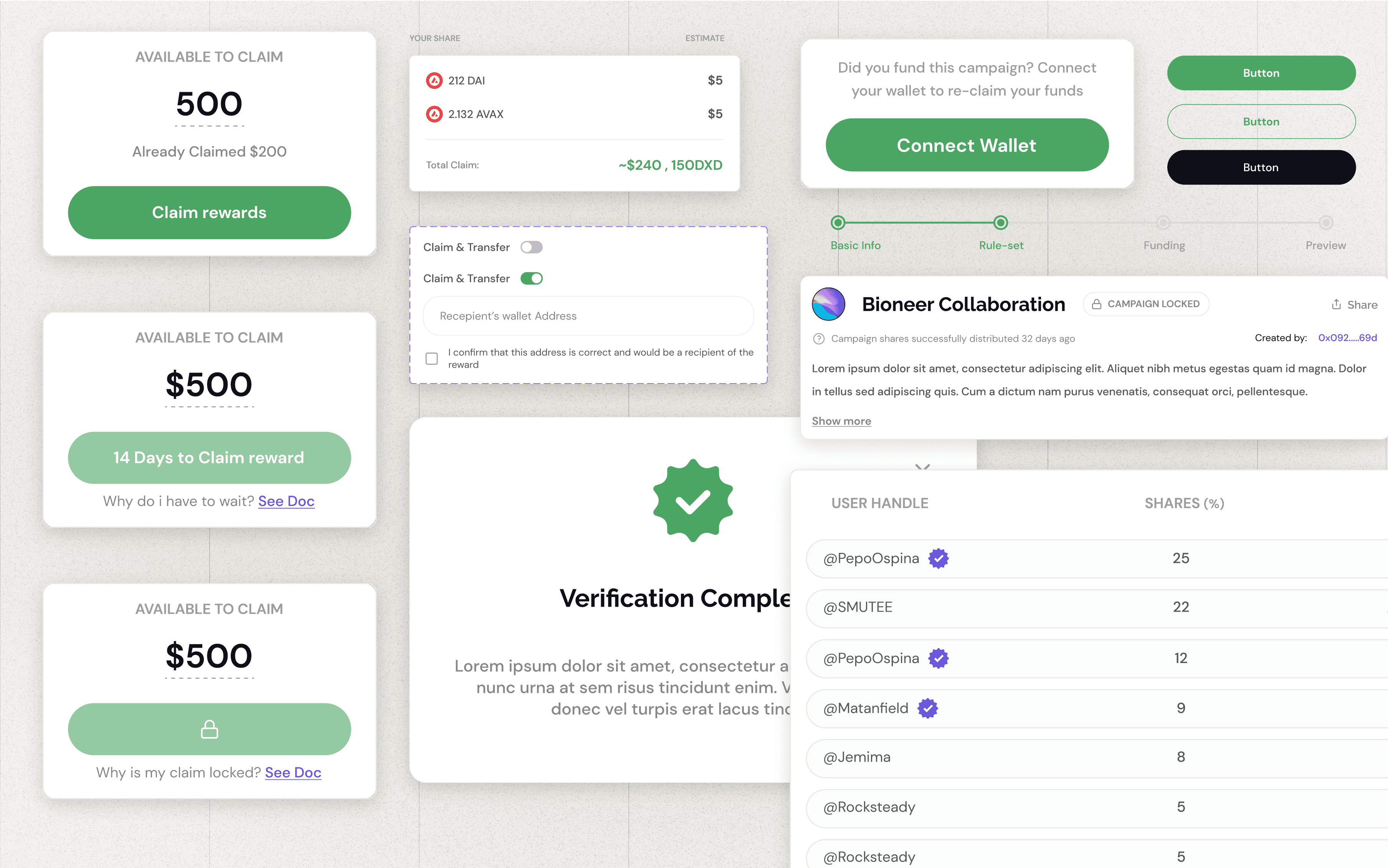 Verification was quite tricky; we wanted users to be able to verify their accounts without using a direct integration, so we had to think of creative ways to achieve that. We slowly realized the same way we have to create the customizable components for each use-case, we also had to do the same for claiming rewards. For the Github campaign, a simple flow prompting them to create a public gist is shown. The flow maps that github account to the user’s wallet address. So we can remember them in the future.