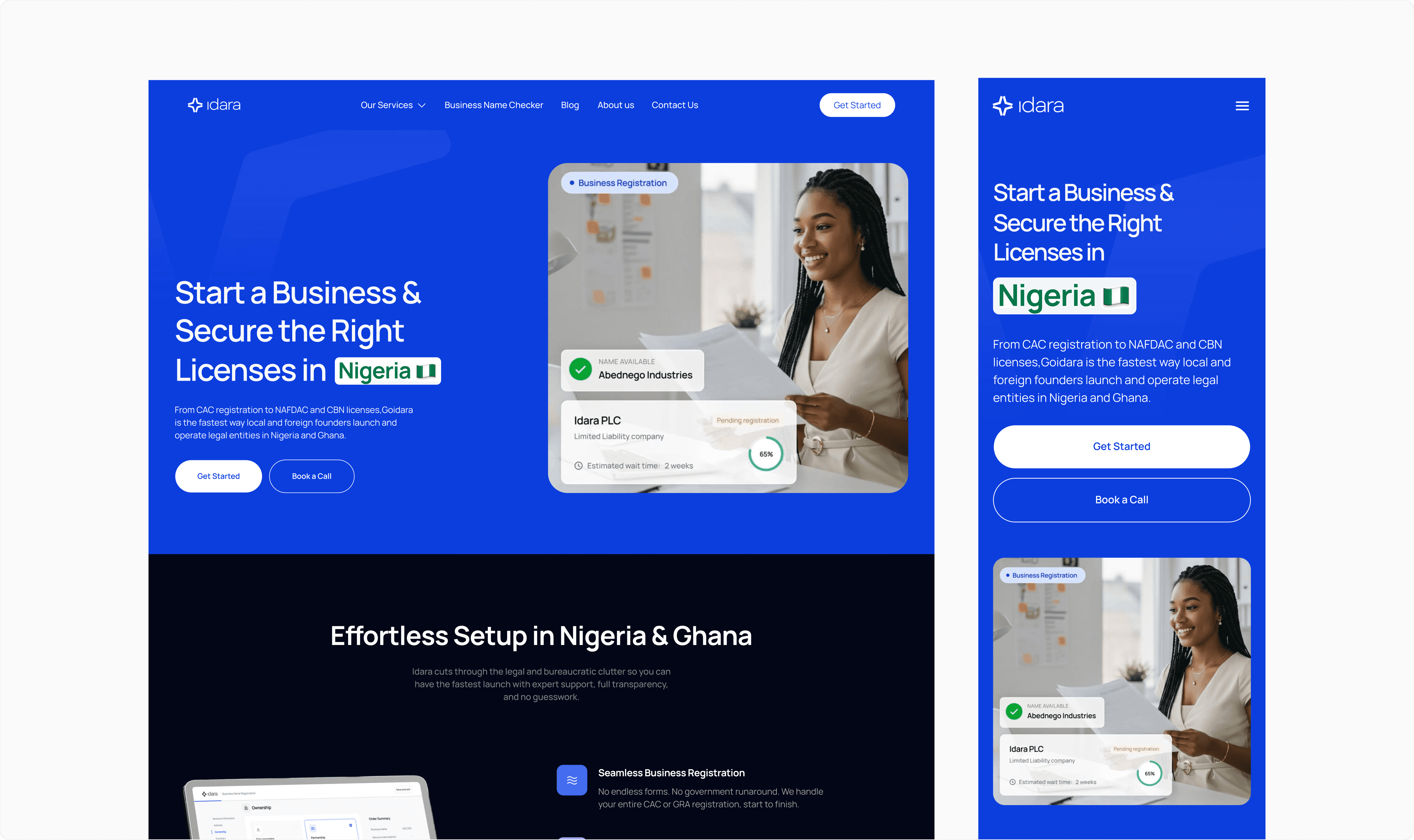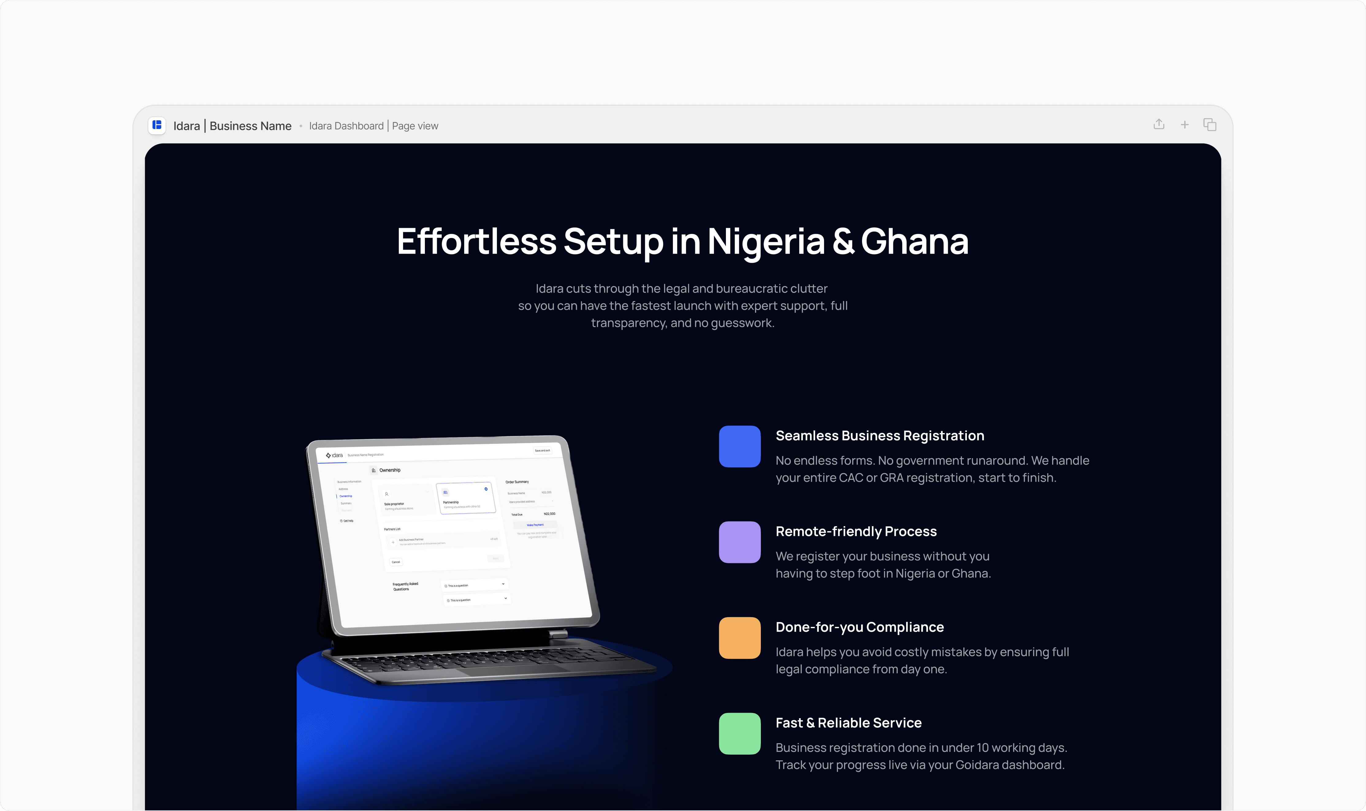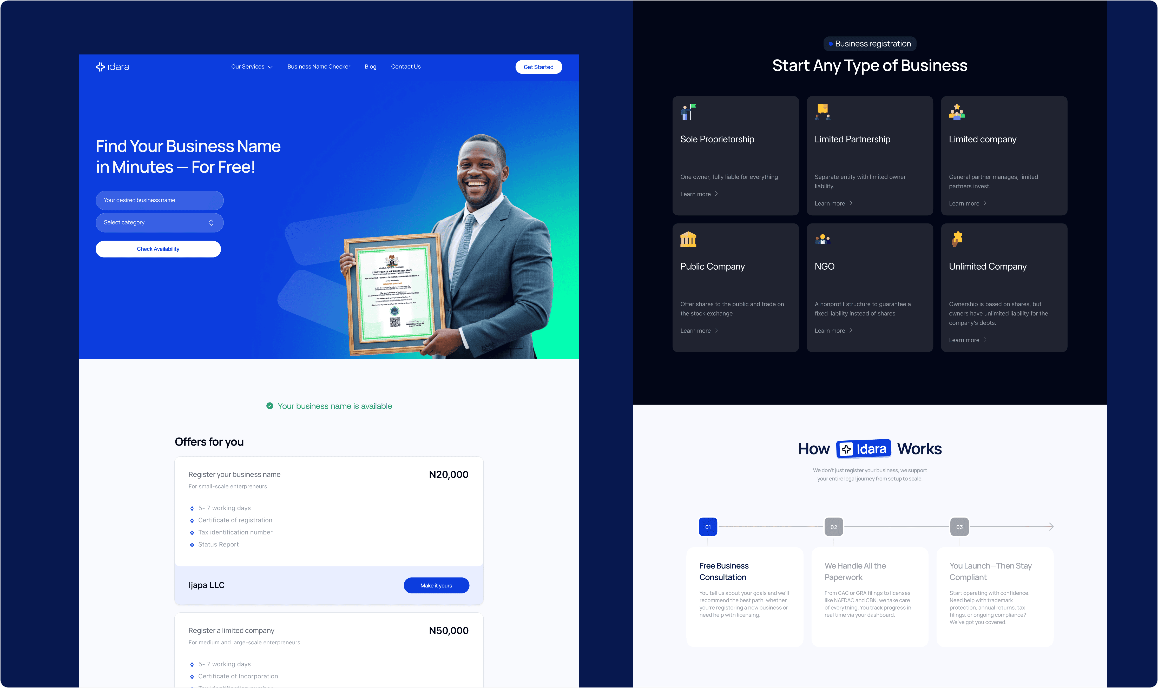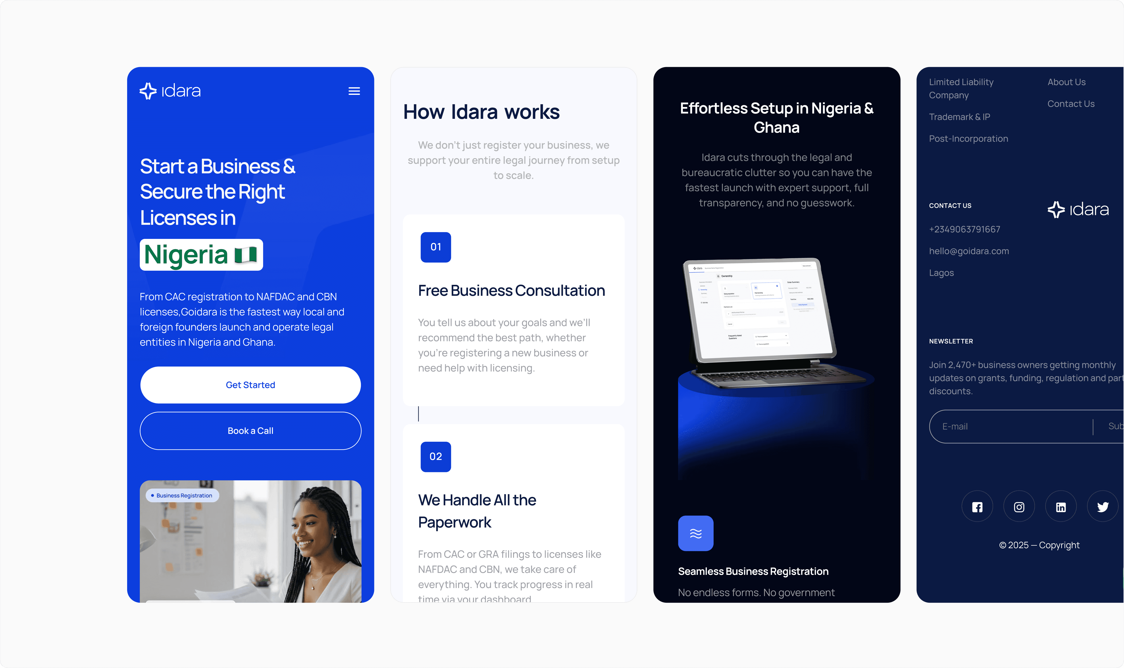 We designed a clean, professional website on Webflow that positioned Idara as a trusted partner for entrepreneurs navigating complex regulations. The site was built with: