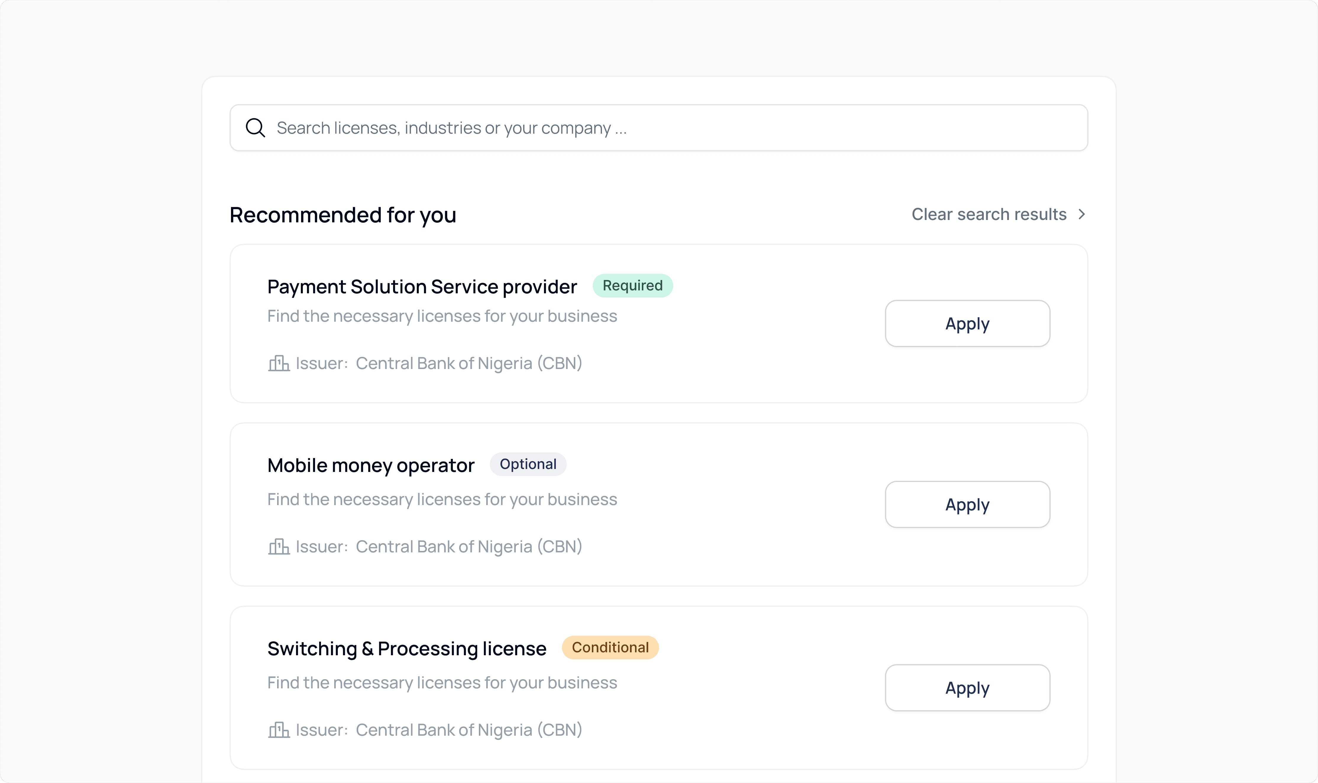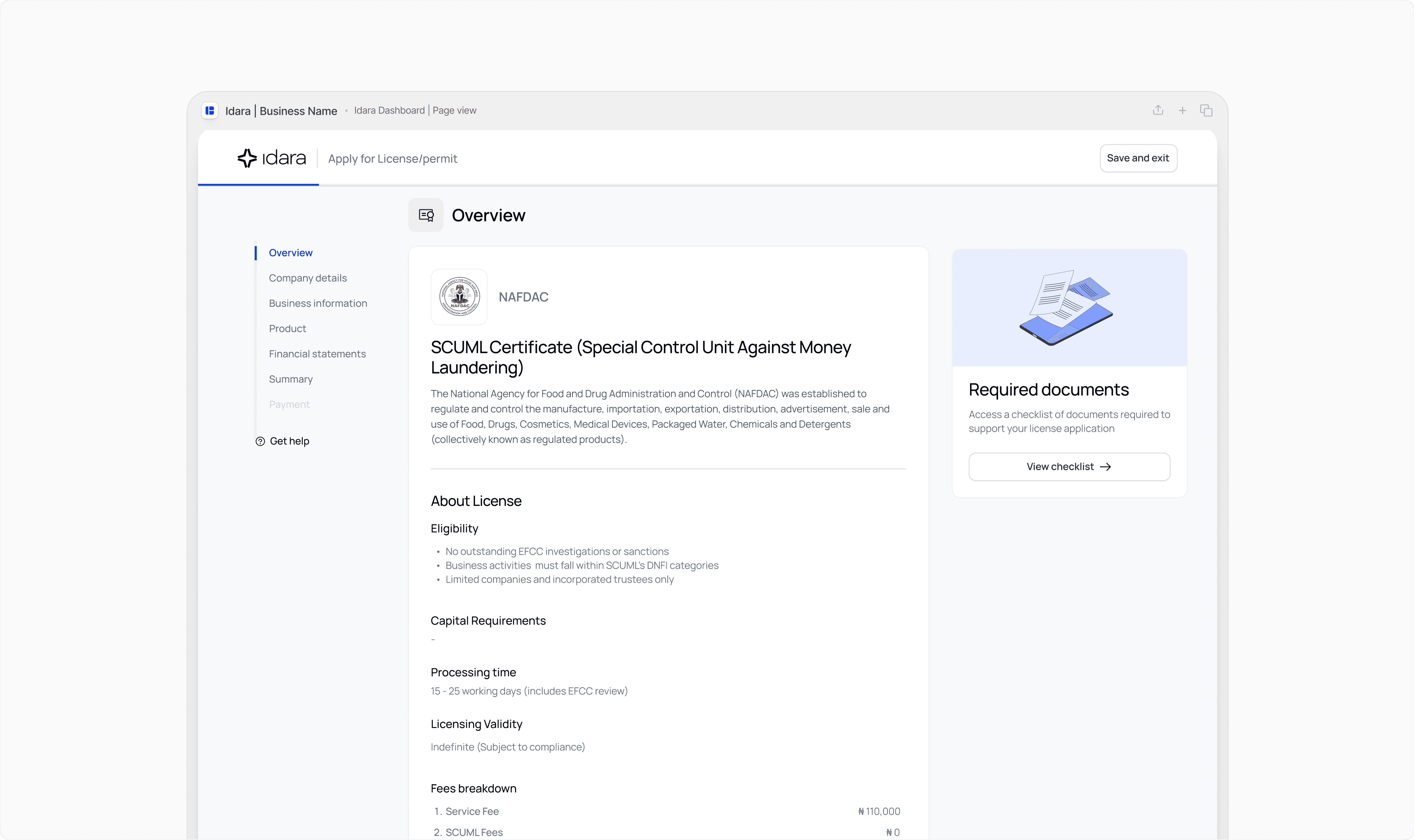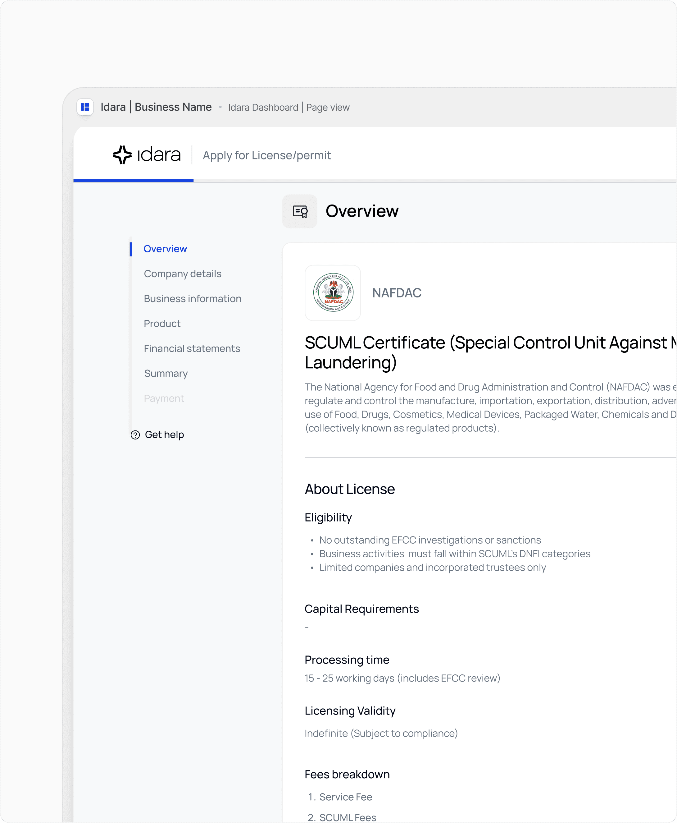 License Applications → guided workflows for CBN, SEC, and NAFDAC approvals.