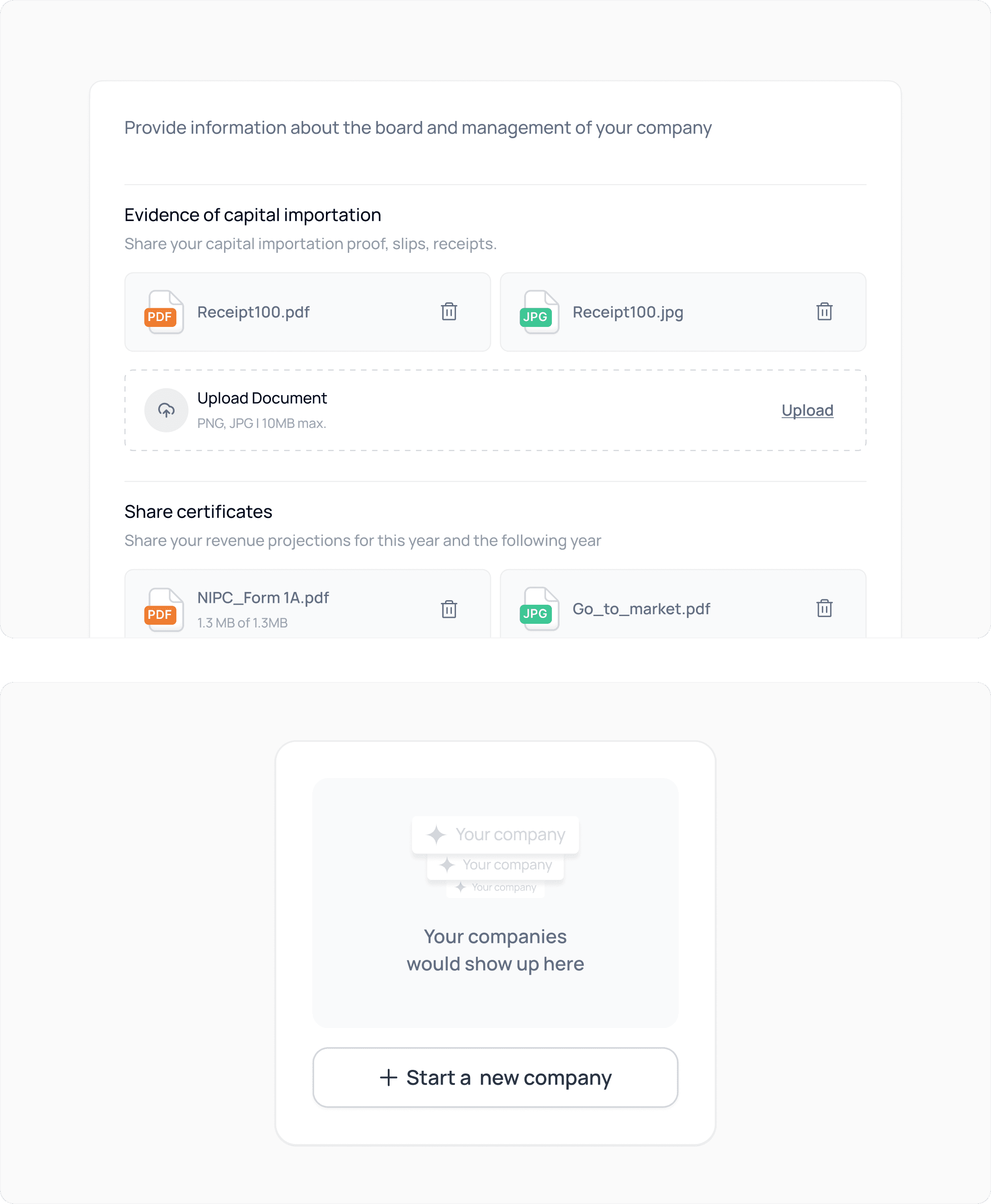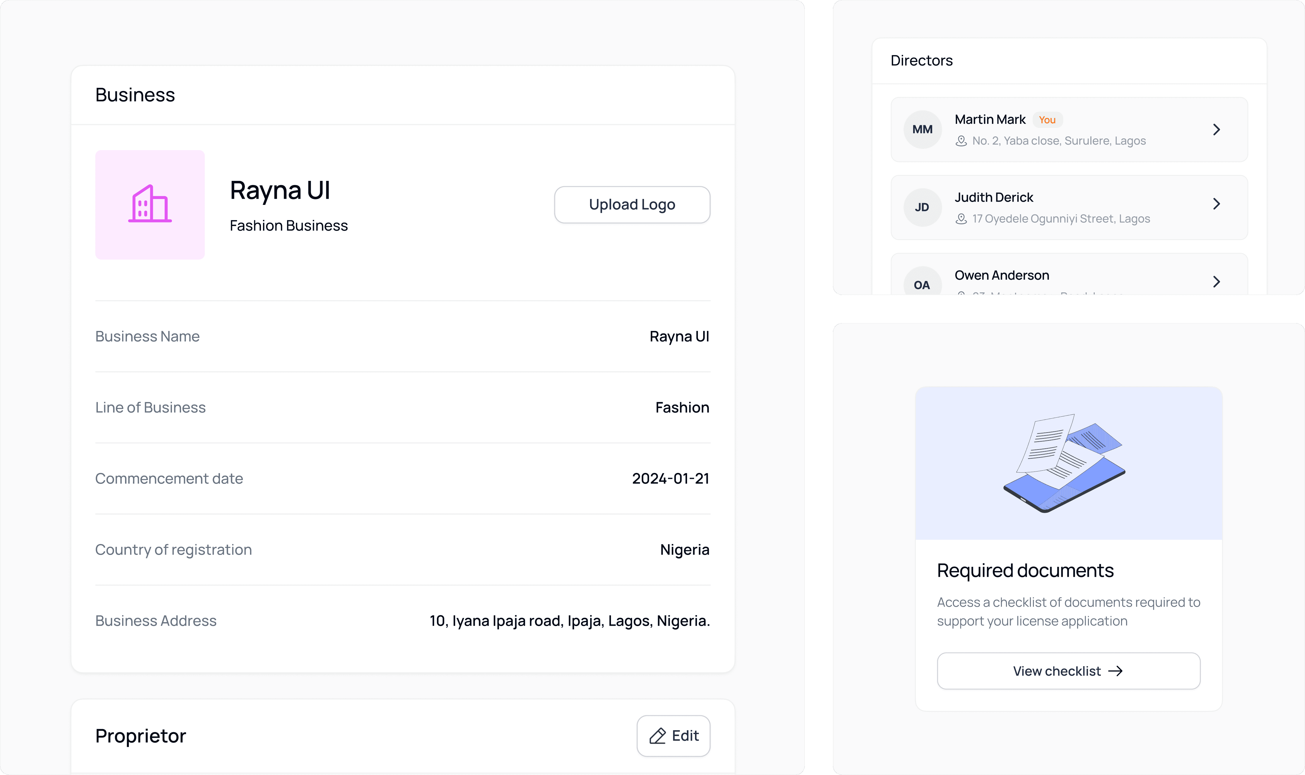 Document Vault → centralized, secure storage for certificates, tax IDs, and filings.
