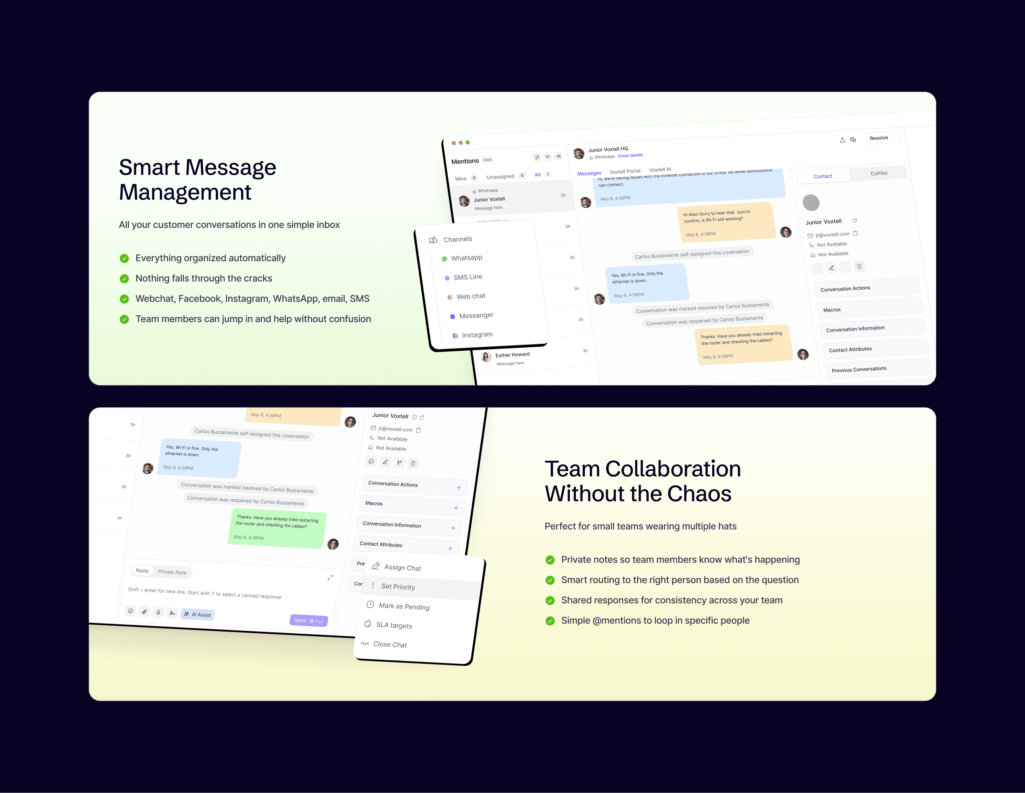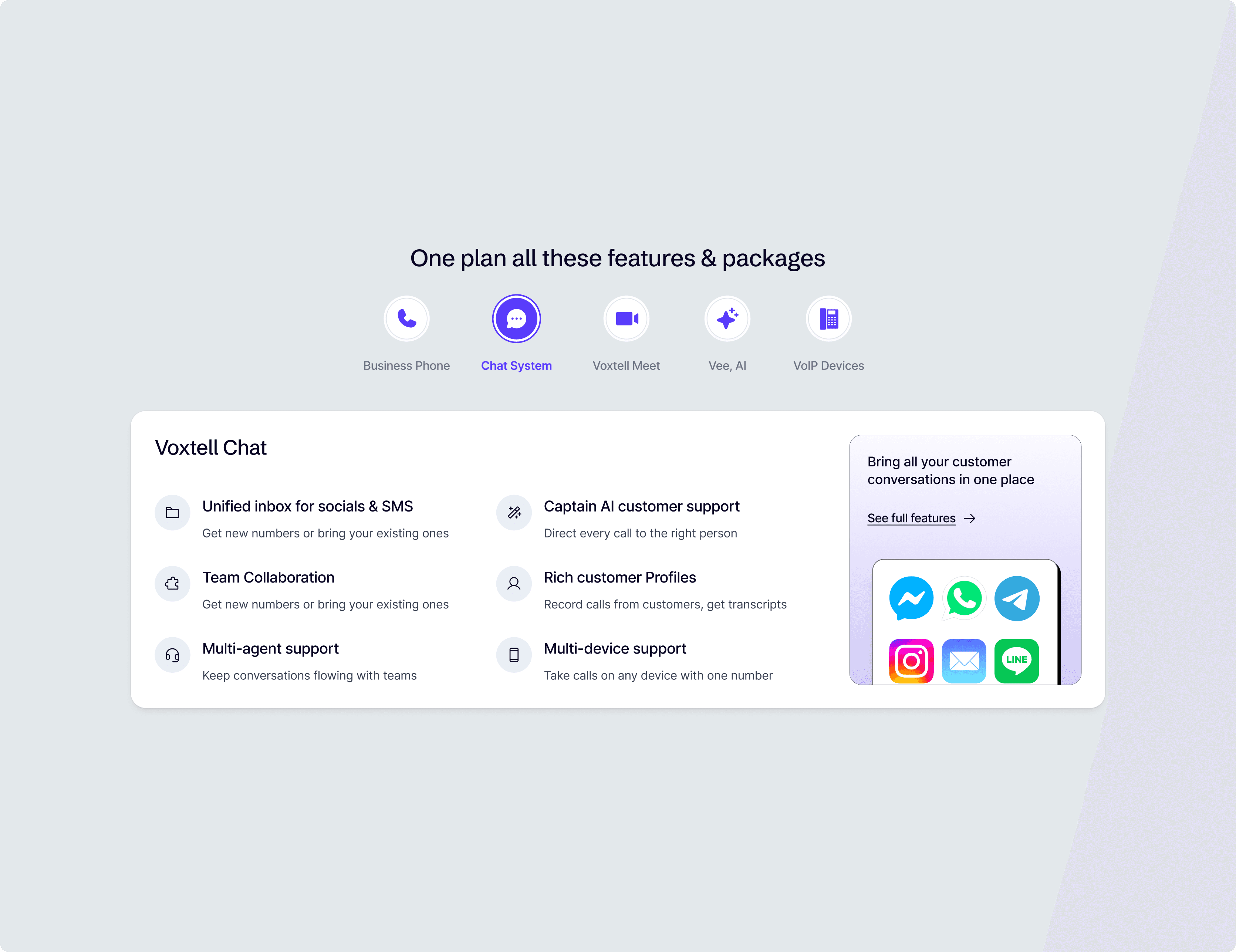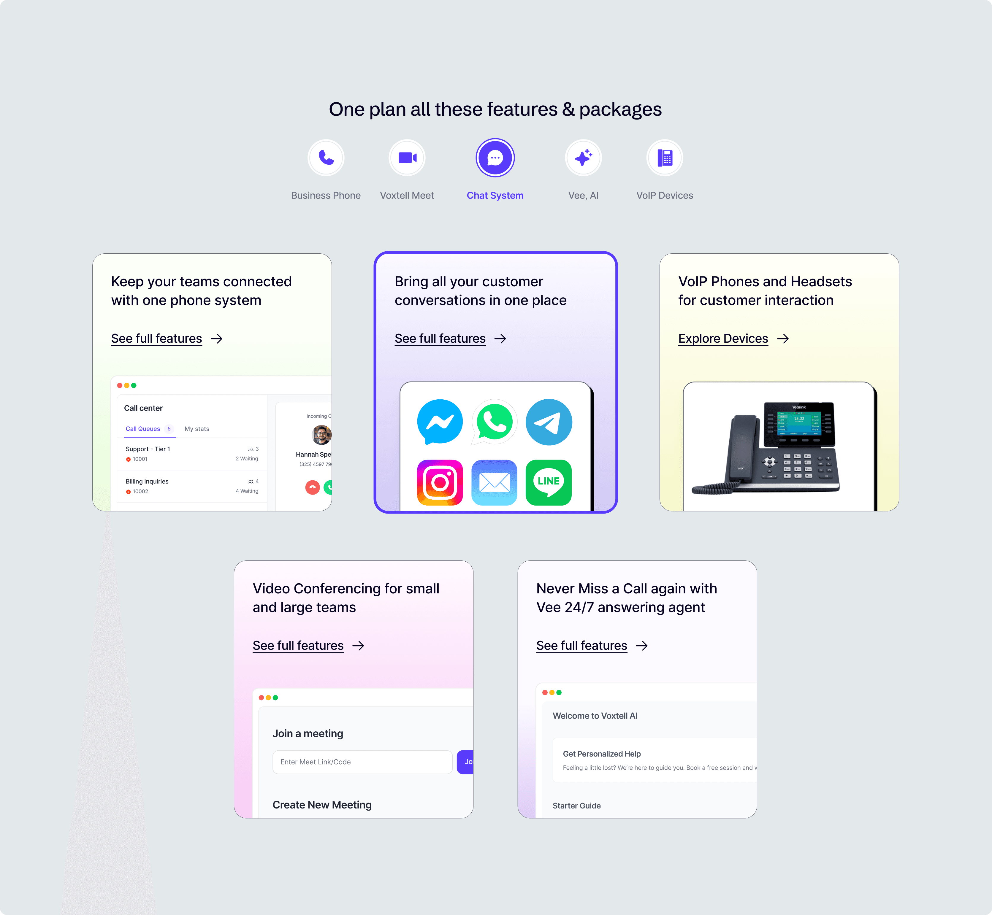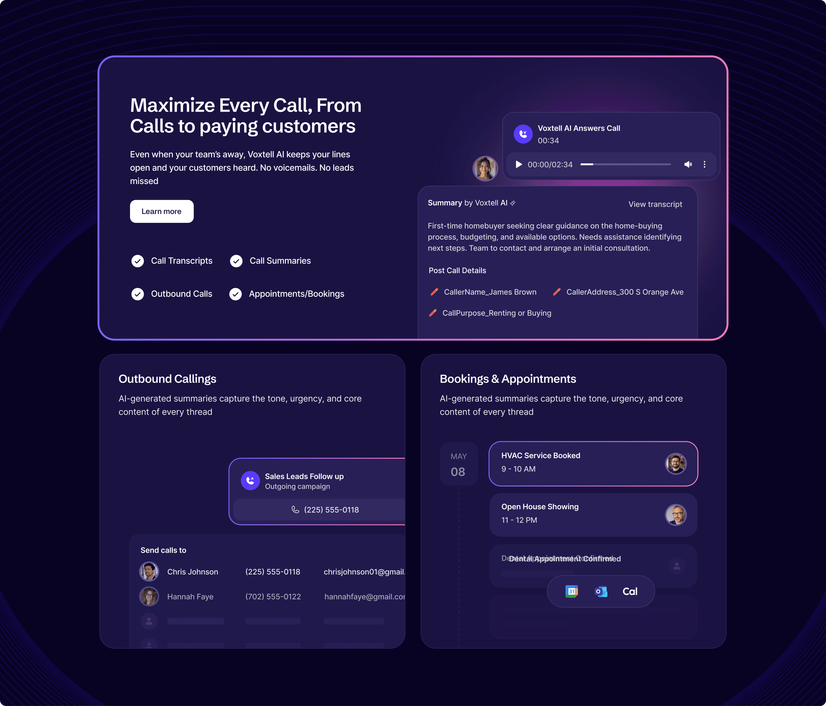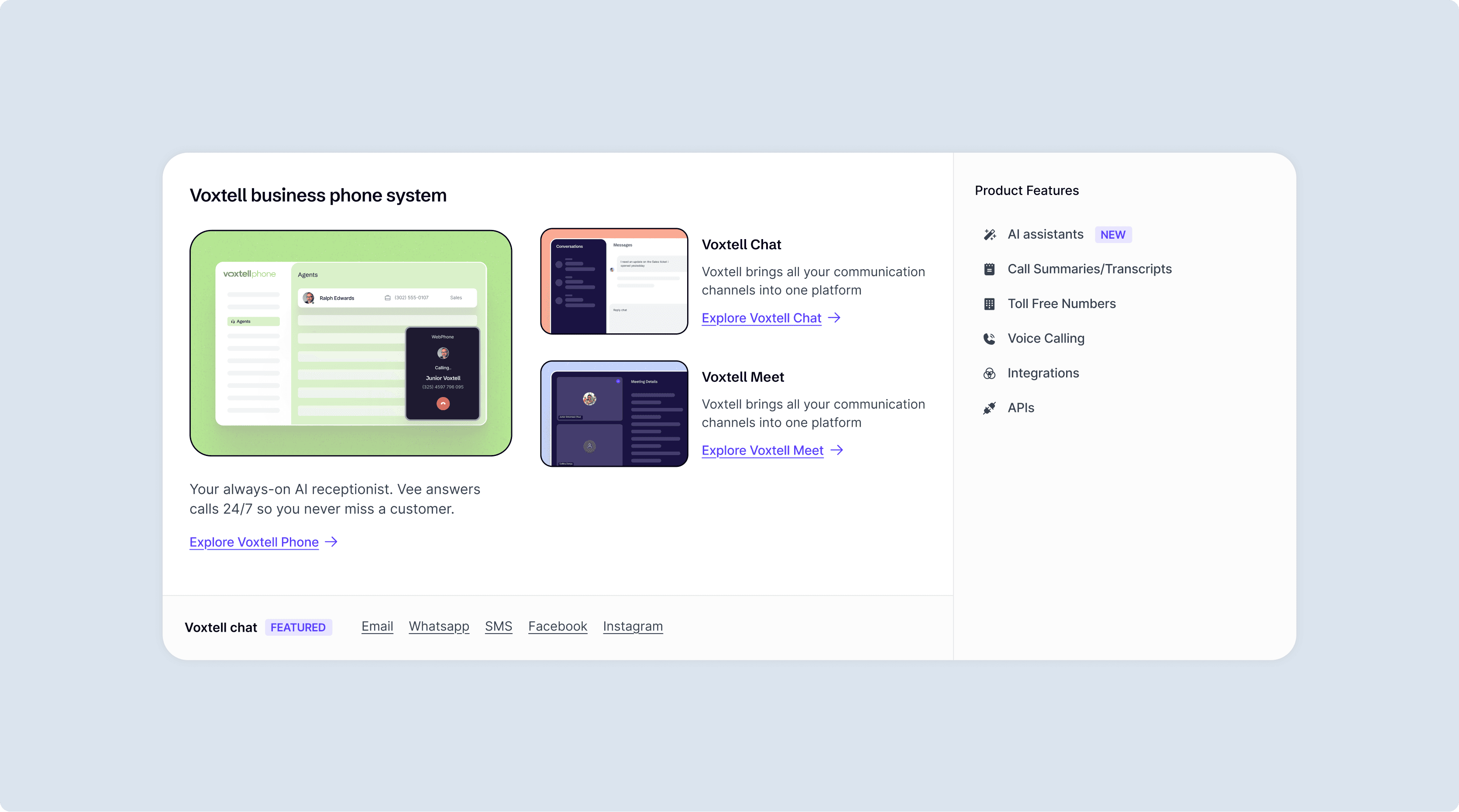 Product Pages that showcased features like call transcripts, AI booking, and multi-channel chat with clarity.