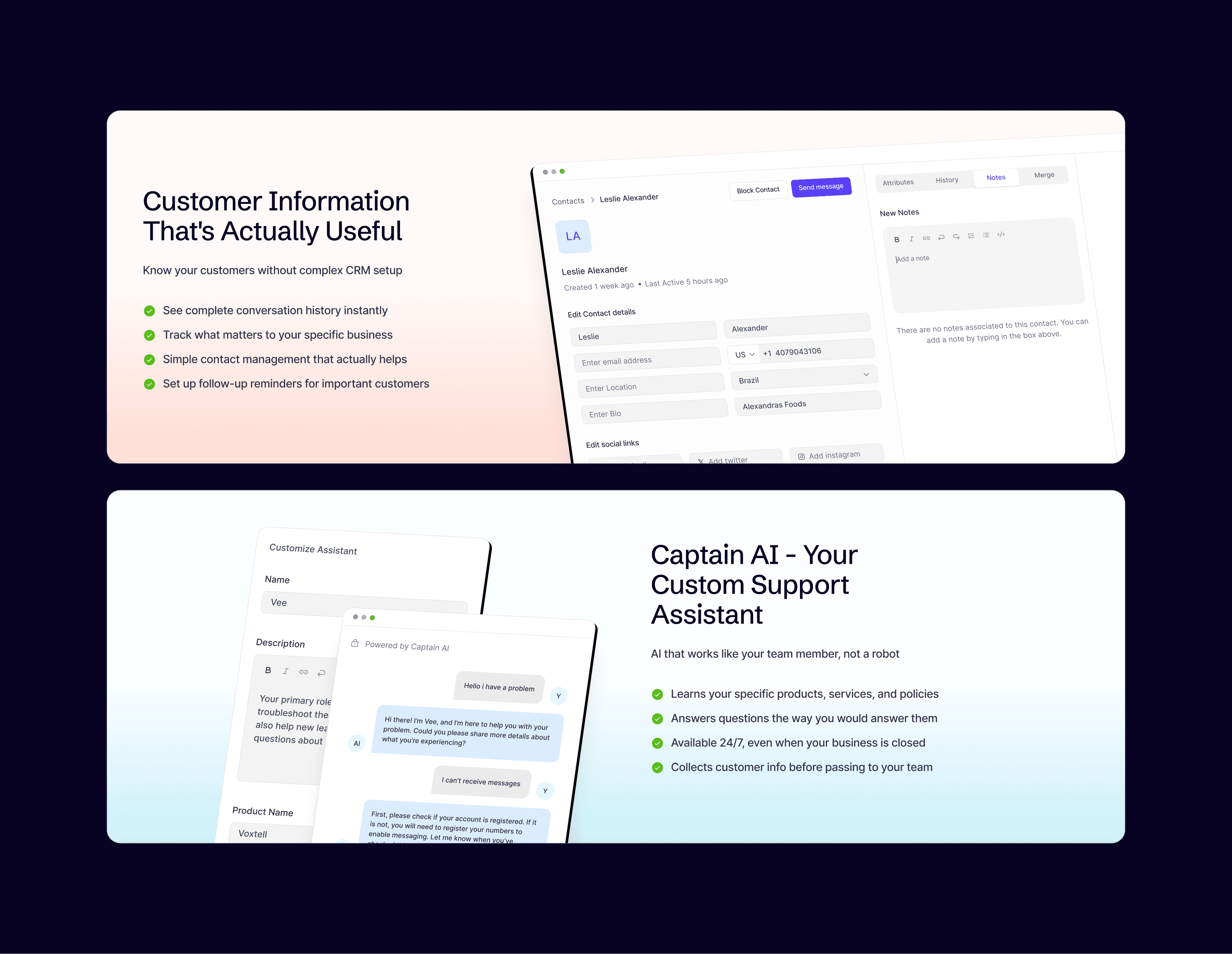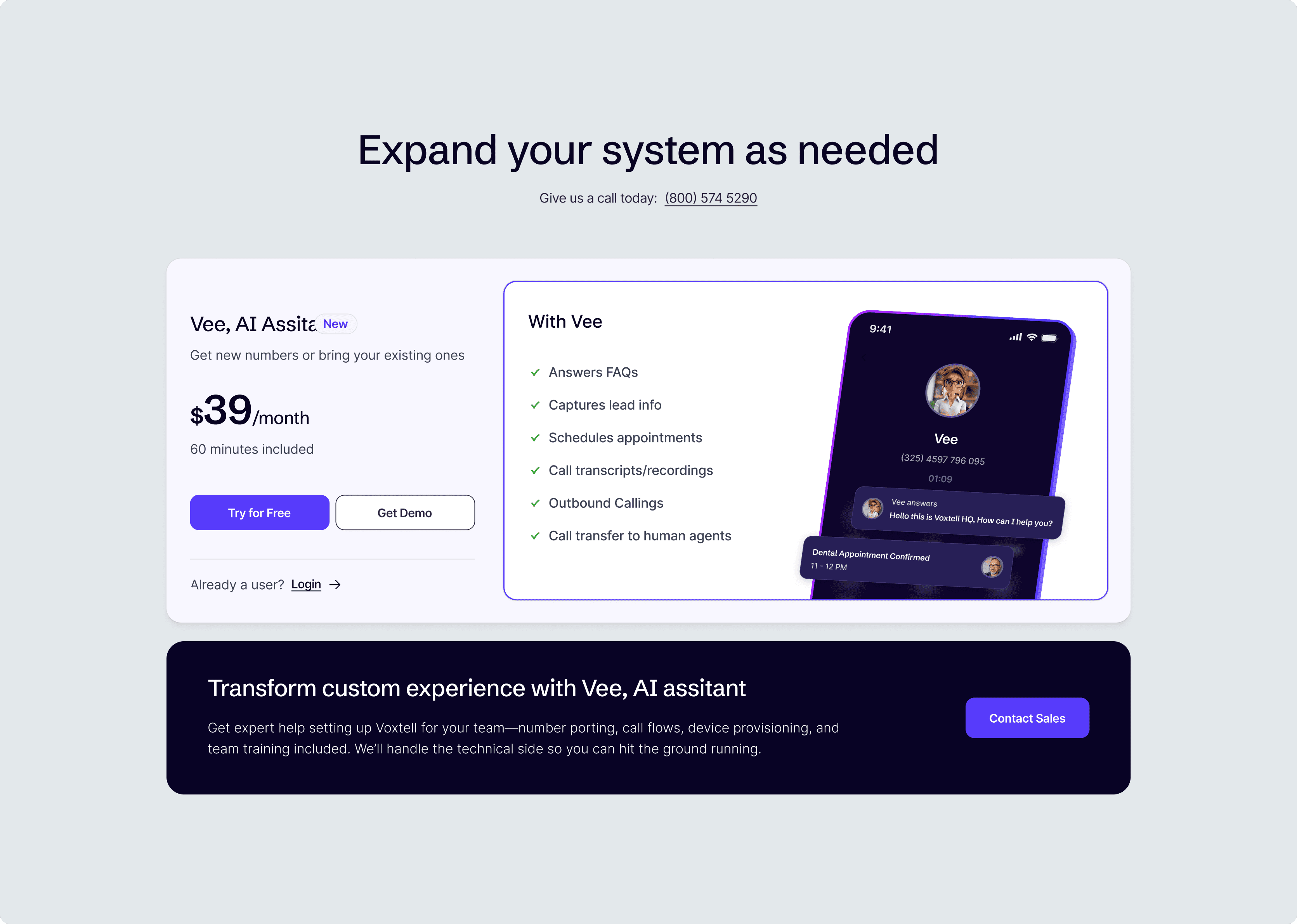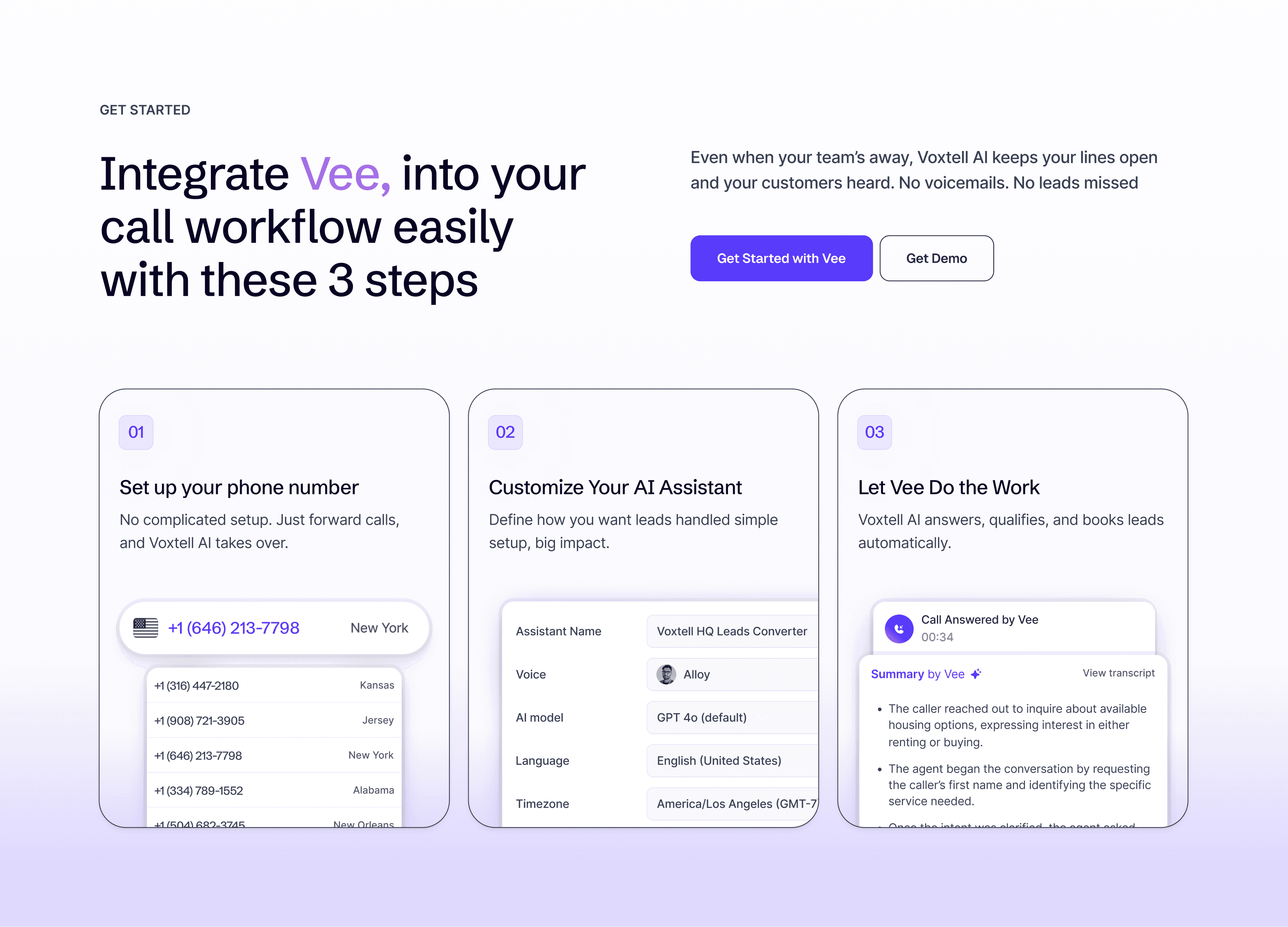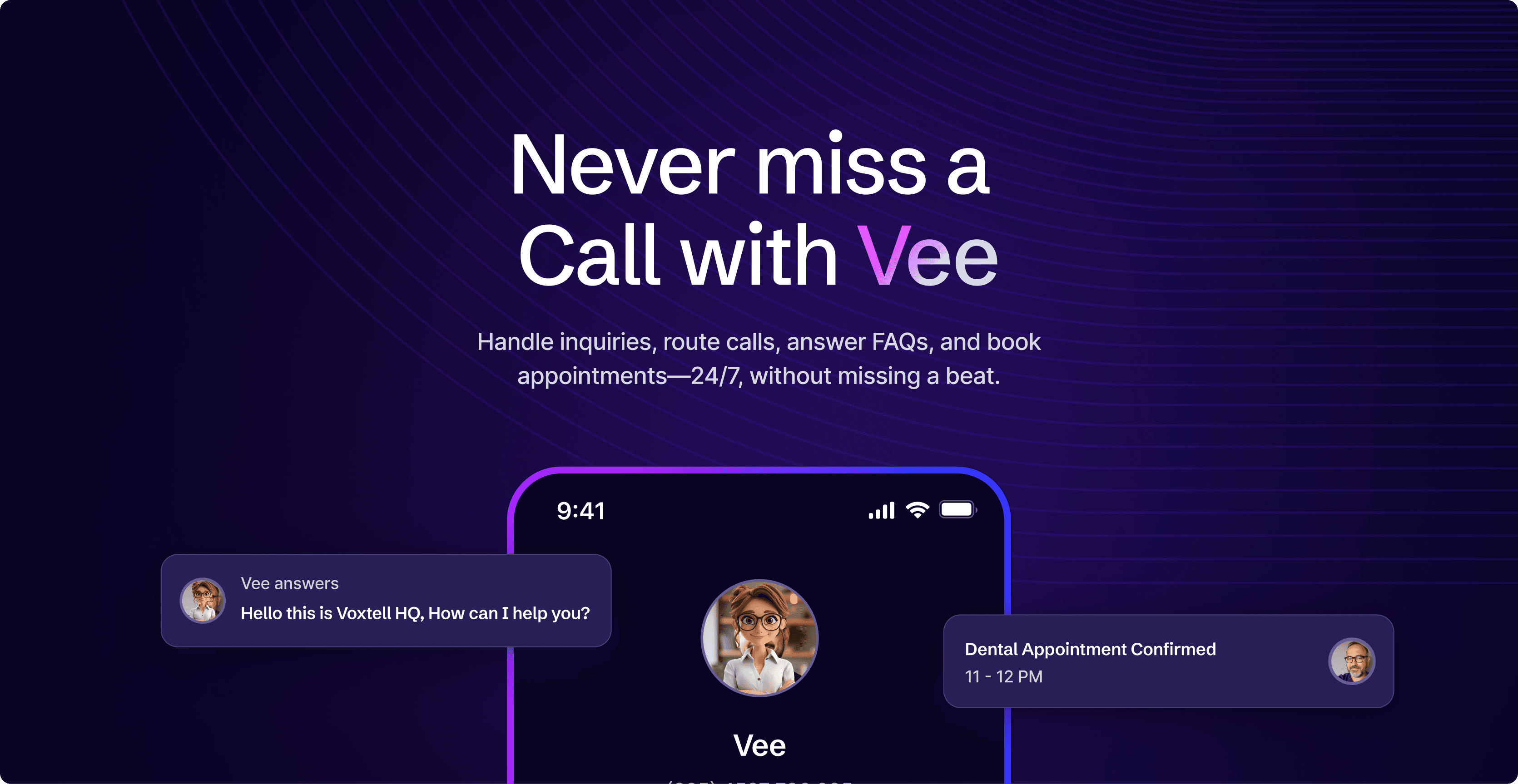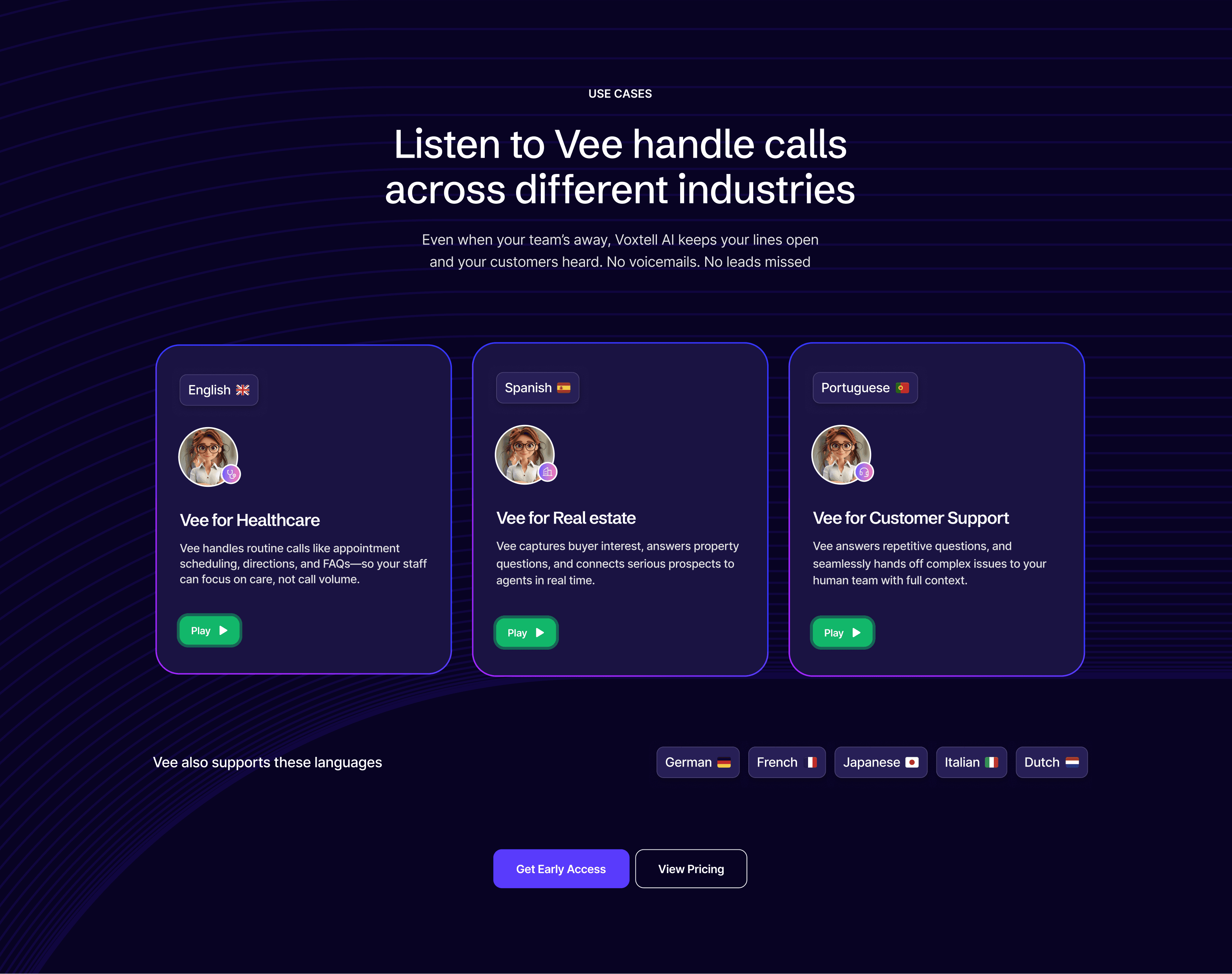 AI-Focused Storytelling → Dedicated pages highlighting Vee, the AI assistant, and its real-world use cases across healthcare, real estate, customer support, and sales.