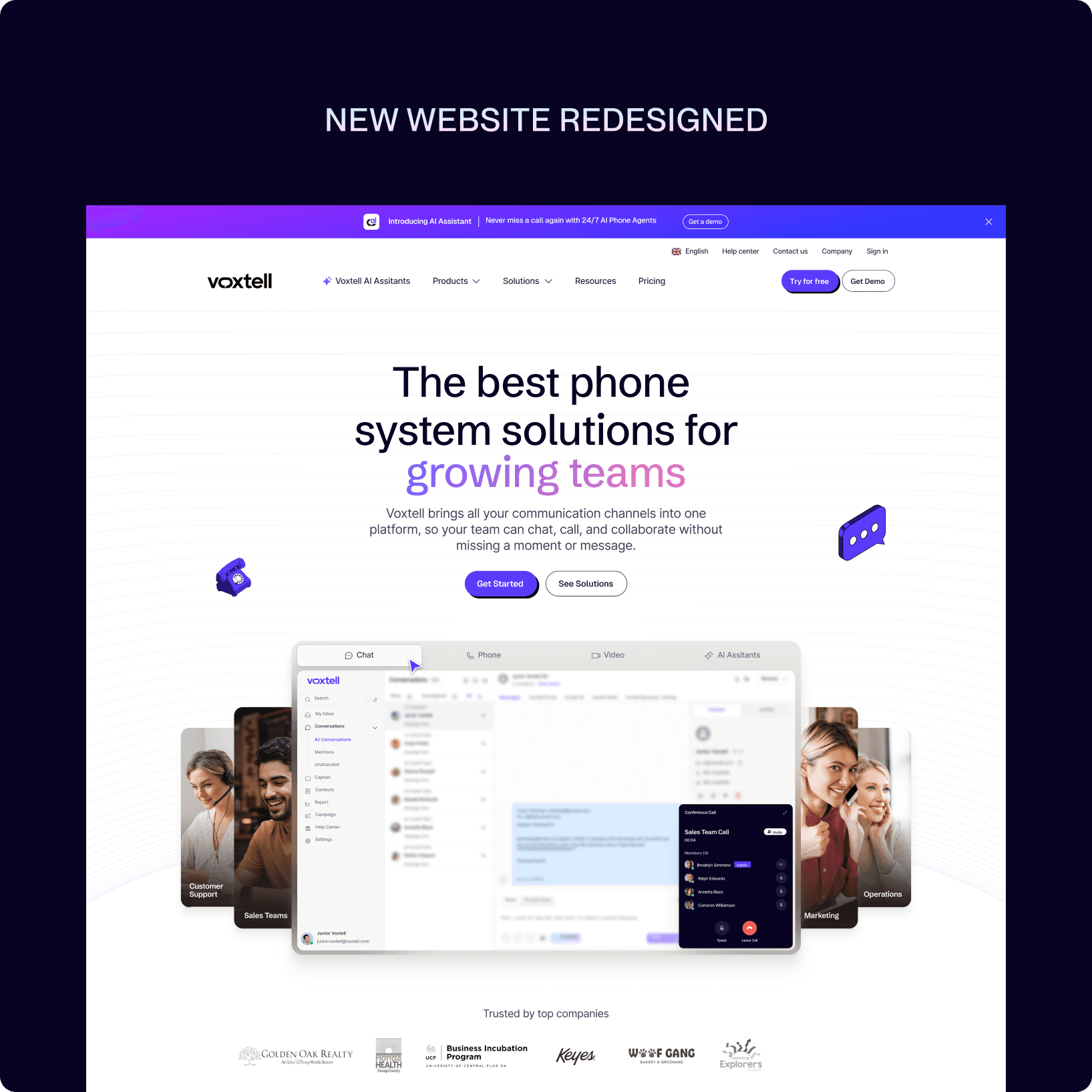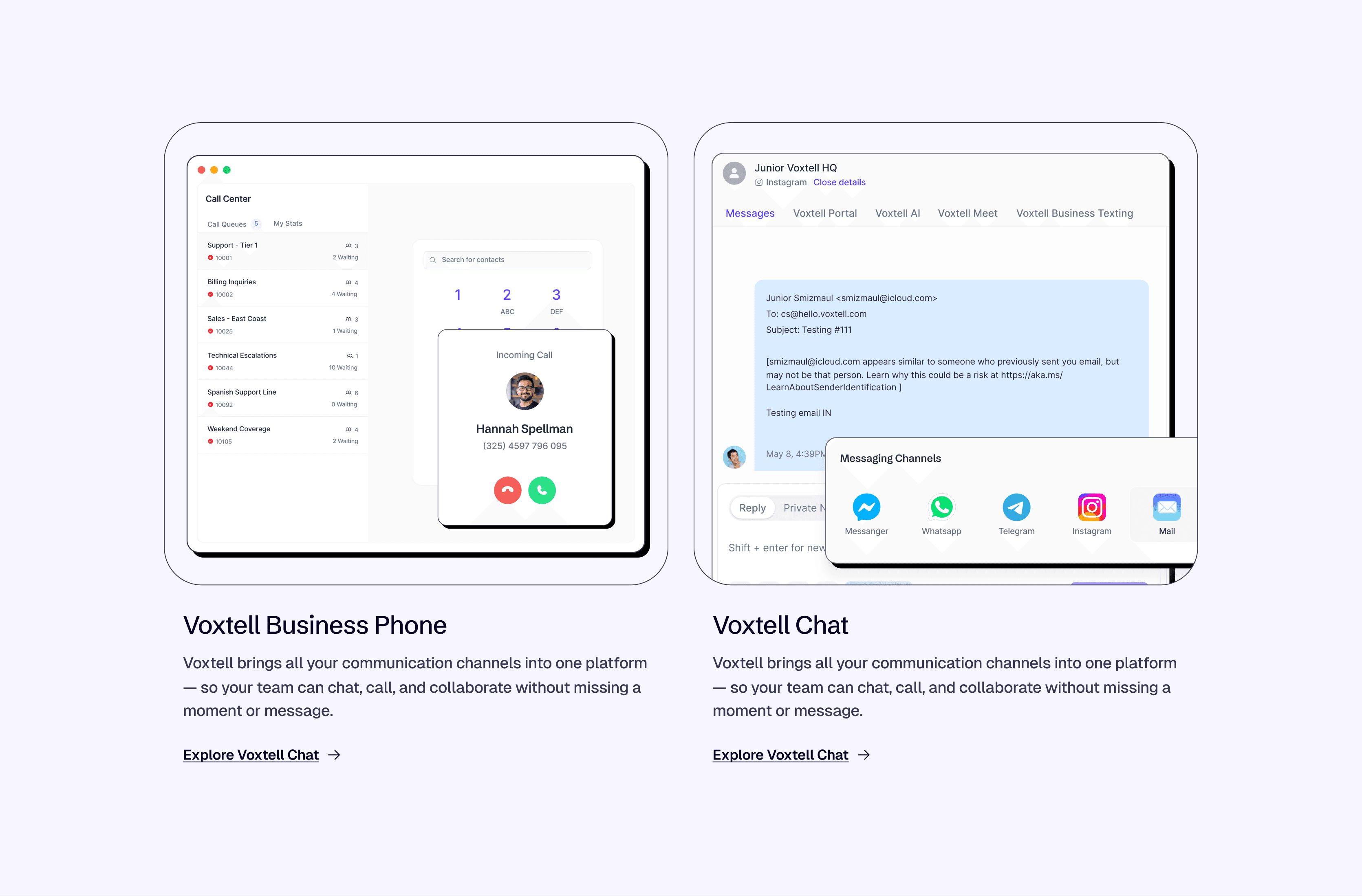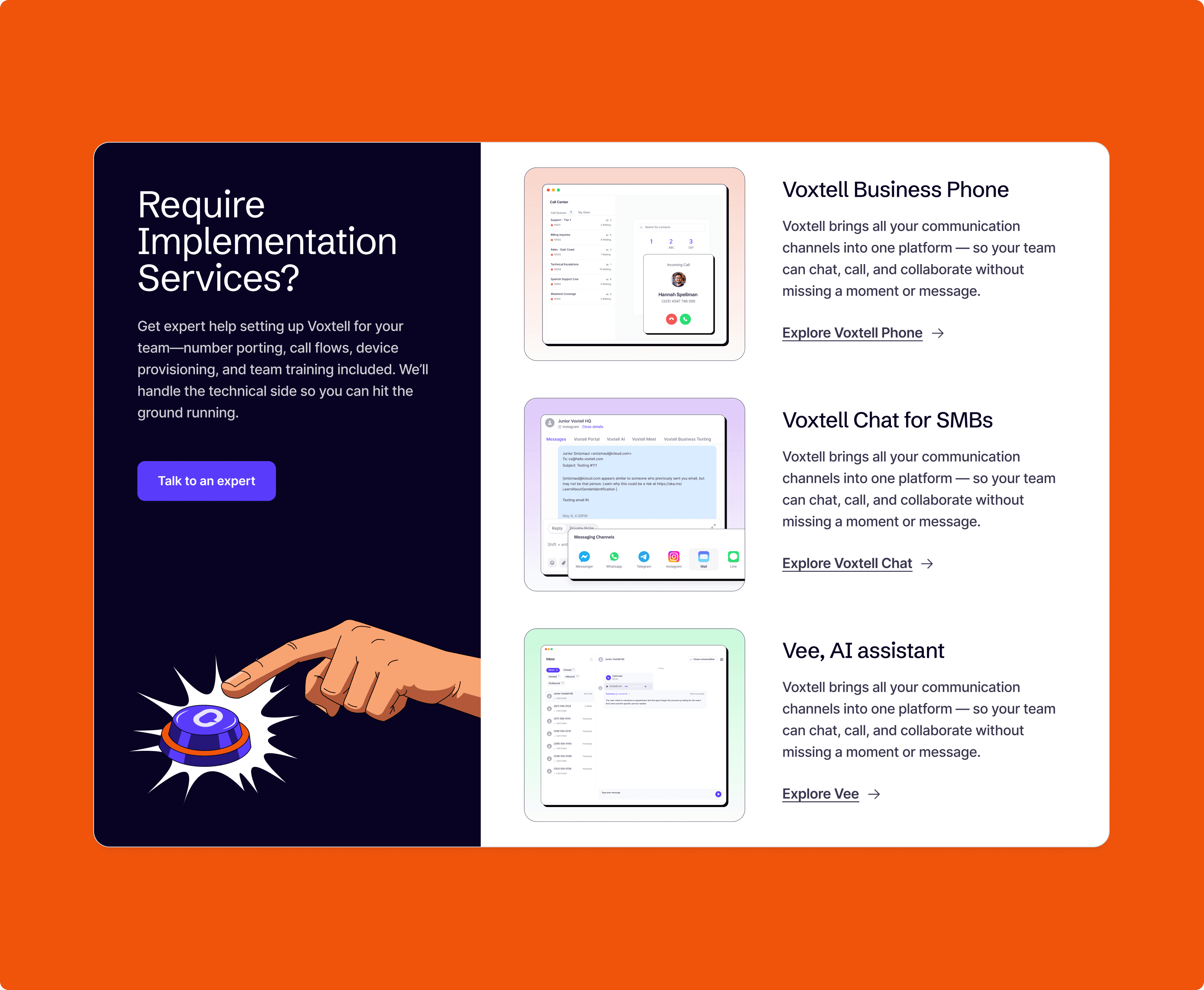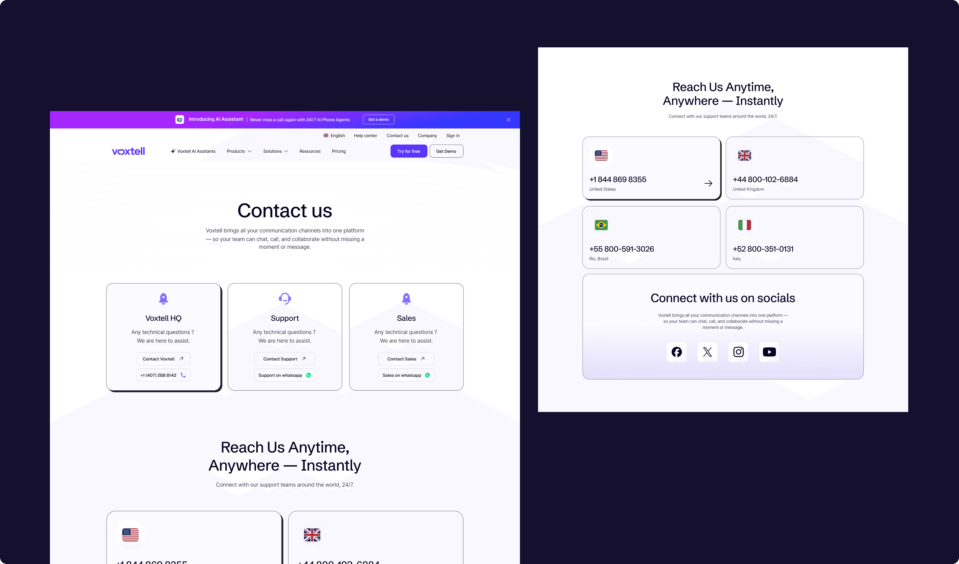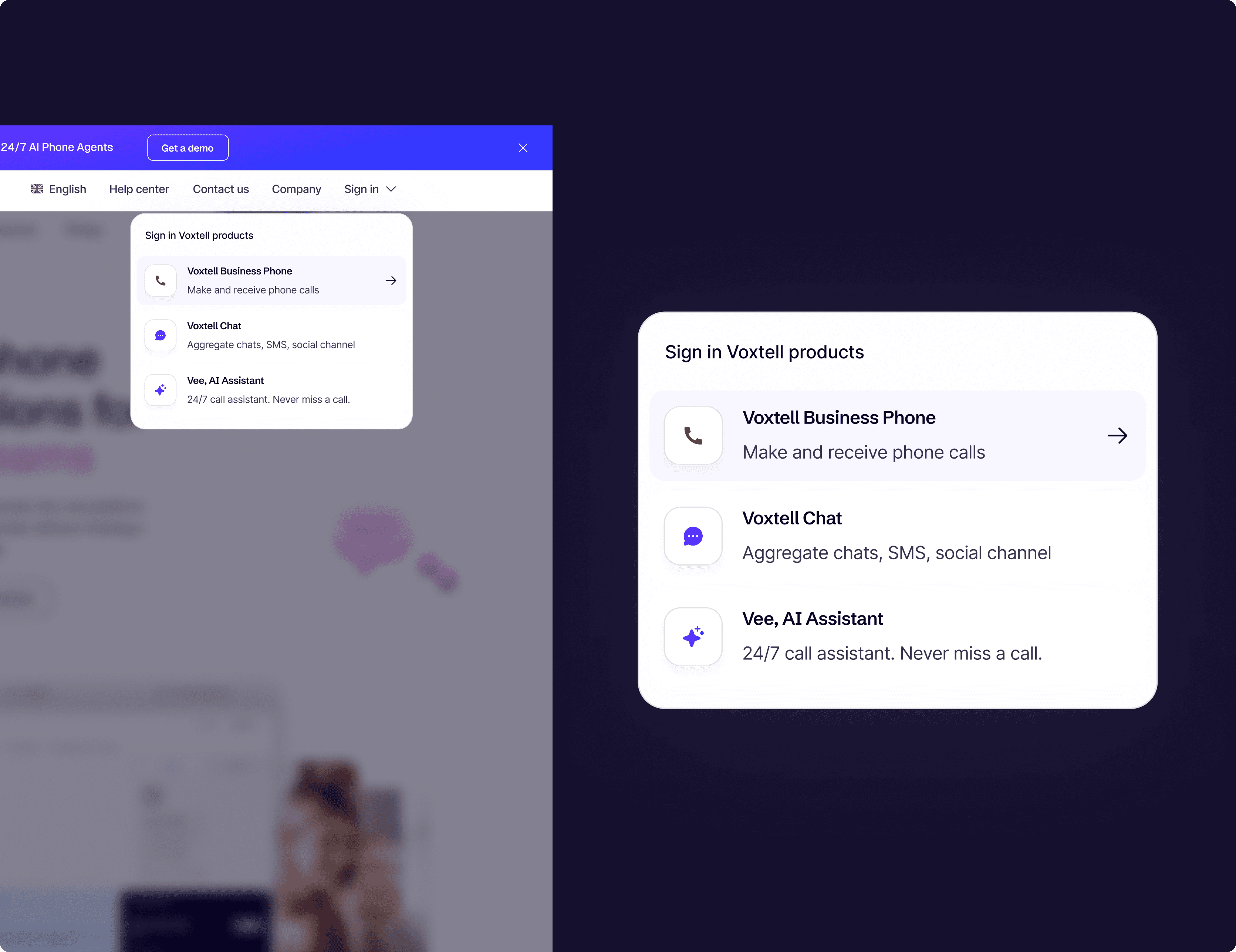 Modern UI & UX → A clean, modular design system aligned with Voxtell’s new brand identity (Vox Purple, Coral Orange, Midnight Indigo).